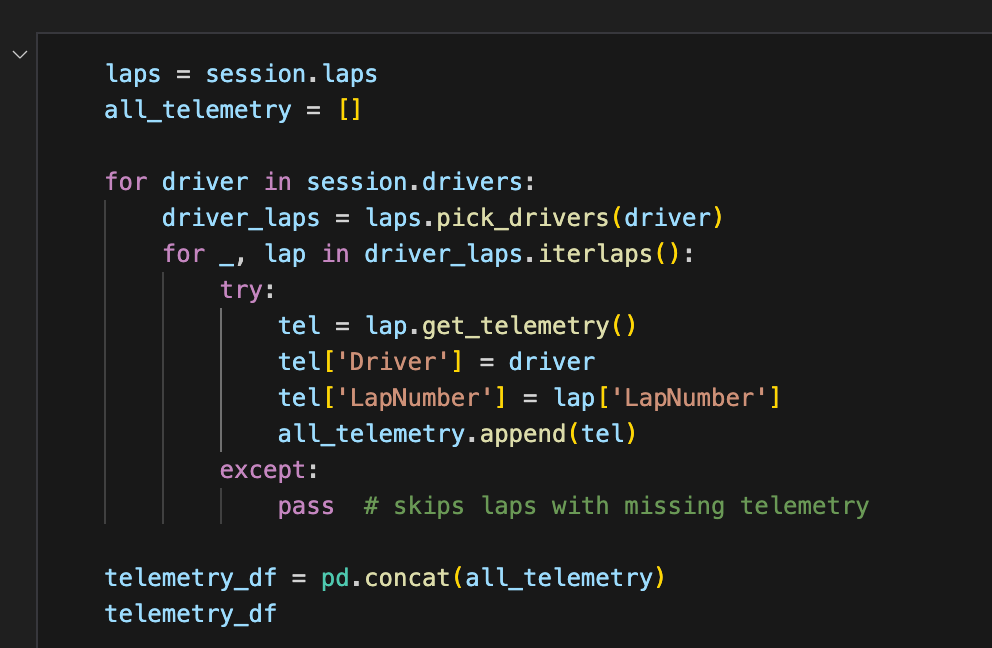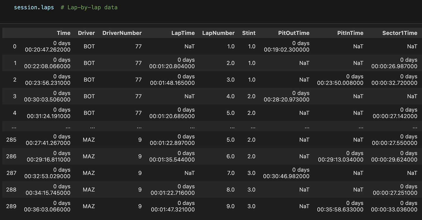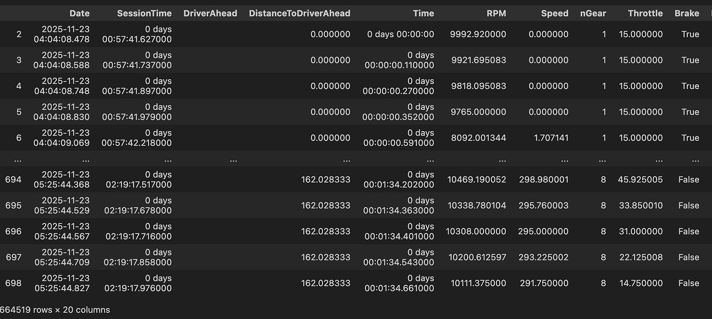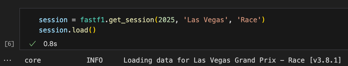 Pass in three things: year, circuit name, and session type. Here I pulled the 2025 Las Vegas Race: fastf1.get_session(2025, ‘Las Vegas’, ‘Race’) then call session.load () and you pull in all that session’s data.