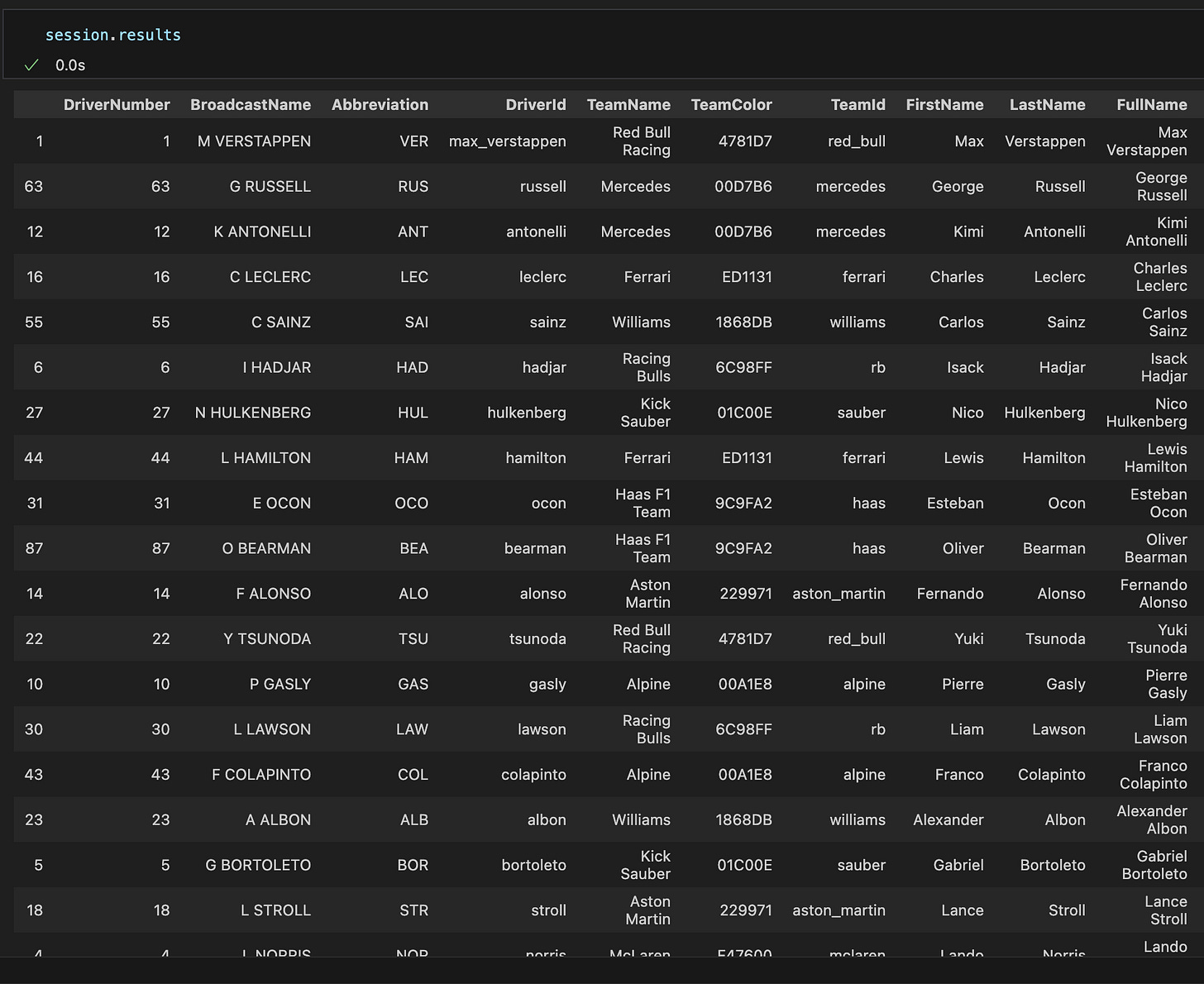 session.results: Is a full DataFrame with every driver, their team, finishing position, and status. If you wanna see who DNF’d or which constructor had a bad day, it’s all right here. (Verstappen won btw 👀)