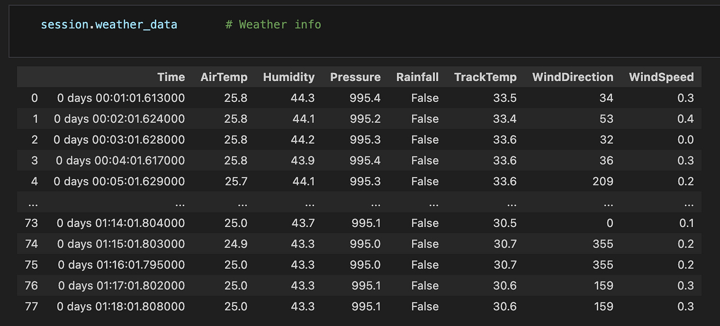 session.weather_data: Air temp, track temp, humidity, pressure, wind speed, wind direction, and rainfall are all mapped across the session.