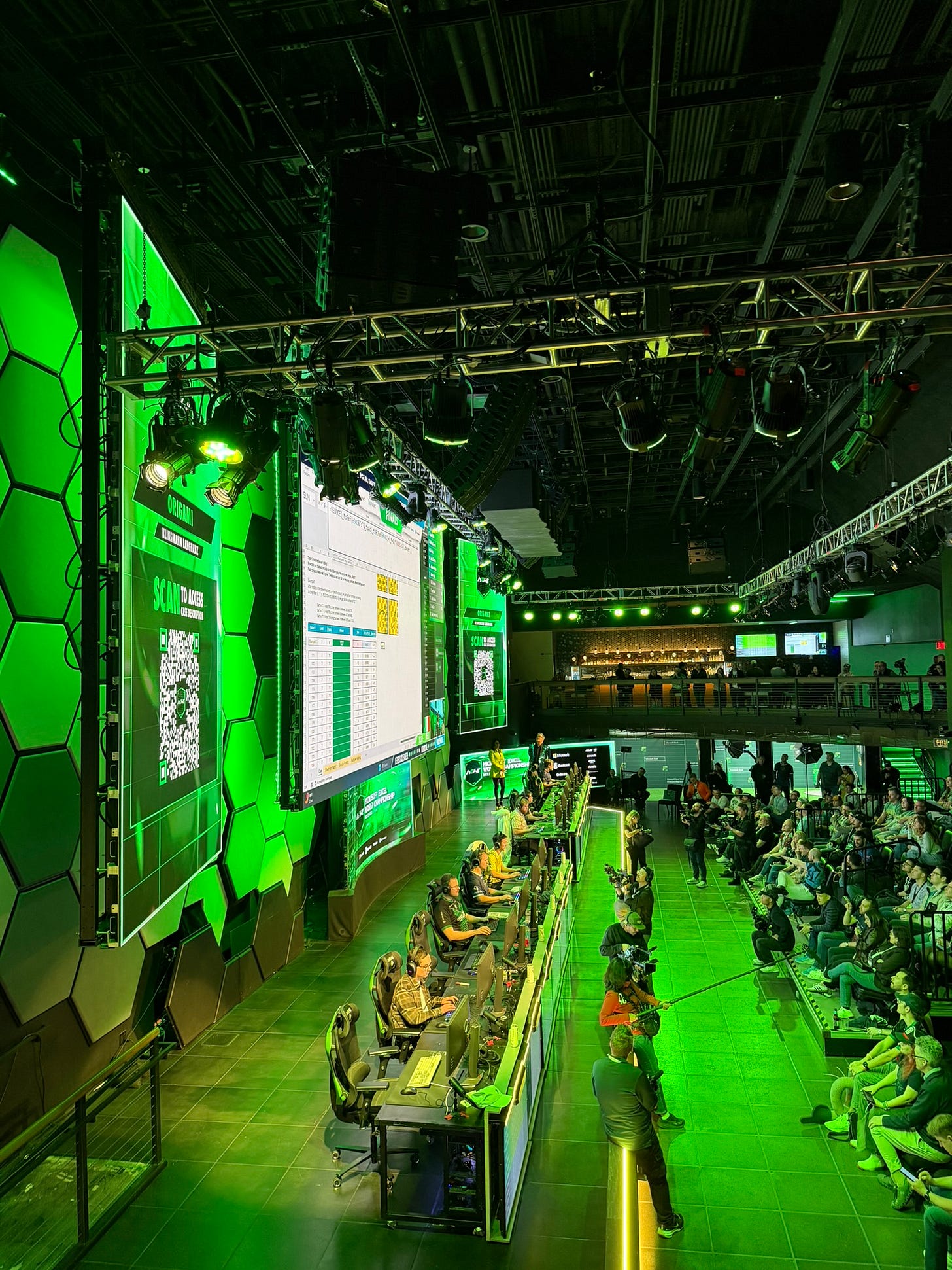 I walked into the esports arena and was so amazed. On the front stage were 12 computers side-by-side with giant screens broadcasting their every move to the whole audience. There were stands for people to sit and watch and even a VIP loft I got to sit in. This was a legit sports event full of emcees, broadcasters, a hype tunnel, and everything!! There was even a bar there because yes, a glass of pinot noir hits hard with some spreadsheets 😂